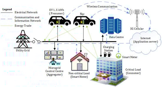 The architecture of an EVaaS system with interactions among subsystems is shown in Figure 1. The EVaaS system typically consists of EVs, loads (critical and non-critical), charging stations, smart meters, power lines, communication infrastructure and a microgrid control centre or aggregators [13]. The system is remotely monitored and controlled by the microgrid control centre using a supervisory control and data acquisition (SCADA) system, while the subsystems communicate with each other through a communication network to effectively carry out tasks and collectively achieve an objective. The communication network facilitates the collection of necessary data from EVaaS subsystems and allows the aggregator to efficiently optimize EV charging and discharging. However, this is dependent on status monitoring and information updates of both parked and moving EVs. The information includes the current location of the EV or where it will be in the next time frame, battery capacity and state of charge (SOC). Using this information, the aggregator can forecast or estimate the energy demand or supply from EVs within a specific region.