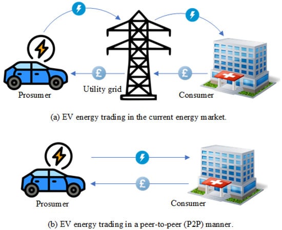 With the rising penetration of EVs, satisfying the ever-increasing energy demand of V2G applications remains a challenge for the distribution system. To address this challenge, recent studies have exploited blockchain technology for energy trading in V2G environments. Blockchain technology enables increased distributed influence in the distribution system while preserving privacy and maintaining transparency and system security [128]. This will improve the flexibility of the conventional energy market, enable a consumer-centric energy market and support prosumer participation. EVs, acting as prosumers or consumers, will be able to trade energy in a peer-to-peer (P2P) manner without third-party intervention, as shown in Figure 2.