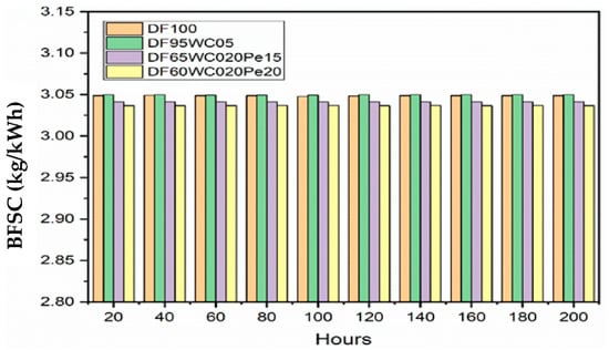 Figure 3 shows the comparative analysis of all test blends with reference fuel. BSFC is influenced by three factors: (1) oxygen content of the additive. (2) Applicable yield power. (3) Engine speed. Once the oxygenated fuels were mixed with the diesel fuel, the BSFC rose because the amalgamation of such fuels with the diesel fuel indicated higher oxygen content that gave better perfect ignition []. While conducting experiments on the engine test bed with diesel fuel and WCO blends, the functioning acquired with diesel fuel was exploited as reference fuel. The outcomes agreed that the utilization of DF95-WCO5 as a fuel increased BSFC compared to diesel fuel under constant load and rpm. Moreover, the high viscosity of WCO and low volatility resulted in poor automation and vaporization. While blending WCO and n-pentanol with diesel oil, it was confirmed that BSFC decreased, as compared to diesel fuel. The BSFC parameter reflects how well the engine is working. After conducting endurance tests, the decreased fuel consumption for the ternary fuel blend was analyzed because an appropriate amount of oxygen in the fuel resulted in a lower heating value. The addition of n-Pentanol to DF95-WCO5 indicated improvement in the BSFC for both ternary mixtures. Investigation showed that the DF95-WCO5 blend had higher BSFC than diesel. However, with the addition of n-pentanol there was 15 to 20% improvement in BSFC results. The experimental results showed that the BSFC of the D95-WCO5 blend increased by 0.32%. However, with the addition of n-Pentanol as a ternary blend, DF65-WCO20-Pe15 and DF60-WCO20-Pe20 improved by 0.49% and 0.68%, respectively.