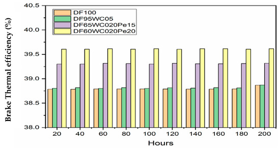 In the investigation of n-pentanol/diesel mixtures of up to 25% in CI engines, the inclusion of pentanol to diesel could expand brake thermal efficiency (BTE), with a minor reduction in output power []. The consequences were attractive as the exploitation of this ternary blend heightened the BSFC and contracted BTE, in contrast with diesel fuel. Improved BSFC and enhanced BTE performance were also recorded in composites of WCO and petrol-diesel [,]. An experimental investigation carried out on a single cylinder diesel engine’s performance at uniform load and constant speed (rpm) for diesel oil and waste cooking oil mixtures was conducted at laboratory conditions. The experimental work showed that the insertion of waste cooking oil in diesel increased thermal efficiency as shown in Figure 4. However, with the addition of n-pentanol as a ternary blend, BTE further improved. Brake thermal efficiency of DF65-WCO20-Pe15 and DF60-WCO20-Pe20 blends was comparable to diesel fuel, due to improvement in atomization. It was observed that the binary blend of DF95-WCO5 had higher BTE, compared to Petroleum diesel, due to its high viscosity and density. Further investigation showed that the average brake thermal efficiency increased with the addition of n-Pentanol as a ternary blend. The experimental data indicated that BTE for DF95-WCO5 improved by 38.7%, while BTE for DF65-WCO20-Pe15 improved by 39.2% and for DF60-WCO20-Pe20 by 39.6%, respectively.