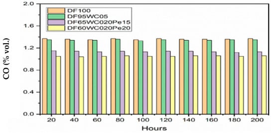 Carbon monoxide (CO) is a colorless and odorless gas. It is a toxic gas, as it confers itself to red blood cells, stopping the uptake of oxygen. It is formed when combustion reactions are incomplete, or the availability of oxygen is lower due to poor mixing []. Thermal combustion is the chief frequent source of carbon monoxide, yet there are several environmental and biological origins that produce and release an important quantity of carbon monoxide. It is poisonous and extremely dangerous in confined areas []. Factors that affect the air–fuel ratio, such as intake pressure temperature, engine operating conditions, and intake tube vacuum, all have an impact on the formation of CO. Figure 5 shows the test outcomes of CO emanation for diesel fuel and waste cooking oil blends with respect to engine running hours. From Figure 5, it can be clearly observed that CO emission for DF95-WCO5 increased, compared to diesel fuel, because of incomplete combustion of the fuel. Moreover, CO emission has been reported to be influenced by the saturation of the fatty acids and found to decrease as the saturation level increases. CO production developed due to burning in the absence of oxygen and reduced flame temperature. The high viscosity of WCO indicated poor spray characteristics, causing unburned fuel. Additionally, the usage of WCO in an engine involves lower air/fuel ratios than diesel fuel. The addition of WCO in diesel caused higher CO emissions while emulsifying it with n-pentanol as a ternary blend brought about lesser emissions of carbon monoxide. Therefore, from the results, the lowest level of CO emission was achieved when the engine was fueled with DF65-WCO20-Pe15 and DF60-WCO20-Pe20, due to the highest levels of saturation. Finally, the results showed that CO emissions of DF95-WCO5 (0.18%) decreased as compared to diesel fuel. However, DF65-WCO20-Pe15 (0.15%), andDF60-WCO20-Pe20 (0.14%) resulted in further decrease, compared to diesel fuel.