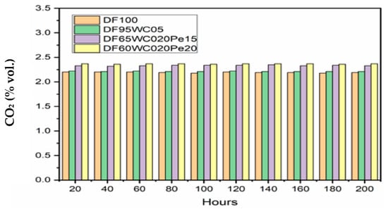 This is one of the major pollutants in the atmosphere. Carbon dioxide is a colorless, odor-less nonflammable gas and is the most prominent greenhouse gas in Earth’s atmosphere []. Figure 6 shows CO2 with respect to engine running hours during the experimental work. It can be noted that the CO2 emissions increased with the addition of n-pentanol as additive. The carbon dioxide (CO2) emissions for using diesel and their blends as the engine test fuels were assessed at constant speed and the same throttle conditions. Experimental investigation showed that CO2 emissions with the addition of waste cooking oil as a binary blend were comparable to diesel fuel. This might have been due to higher kinematic viscosity, density and longer ignition delay of the WCO. Carbon dioxide is produced when complete combustion takes place. As WCO is highly viscous and dense n-pentanol alcohol was added as a ternary blend to reduce viscosity and density of blends to lead to complete combustion. Finally, the results showed that CO2 in the case of DF65-WCO20-Pe15 (0.511%) and DF60-WCO20-Pe20 (0.518%) increased compared to diesel fuel under the same operating conditions. However, the binary blend DF95-WCO5 showed an increase (0.48%) in comparison to diesel, due to inadequate combustion of fuel.