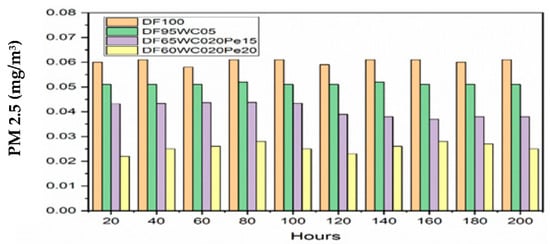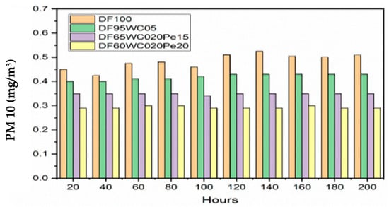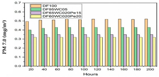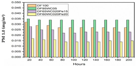 Particulate matter is a common term used to delineate a multifarious group of air toxins that differ in dimension and structure. Generally, there are two categories of particulate matter, one coarse particle (great than 2.5 mm) and the other are fine particles of less than 2.5 mm. Soot is a fine particulate. Figure 7 illustrates particulate matter emissions for diesel fuel and waste cooking oil blends with respect to engine running hours. PM at the exhaust decreased when using WCO, because of the presence of oxygen content in the oil, probably to let the soot form. PM effectively reduced the mass concentration of particulate matter []. The n-pentanol/diesel blend could more effectively inhibit the formation of elemental carbon and reduce the emission of particulate matter. When the blending ratio of the n-pentanol increased, the total particle amount reduced, due to a large decrease of 50 nm or more in the particle size. During experimental work, it could be observed that the DF95-WCO5 binary blend produced higher Particulate matter (PM-1, PM-2.5, PM-7 and PM-10) emissions compared to DF100.N-pentanol, which, containing oxygen, could provide more oxygen during the combustion process, reduce the local anoxic conditions in the cylinder, and suppress the formation of soot []. Furthermore, the C-O bond in the n-pentanol molecule has a higher bond energy, which reduces the formation of soot precursors and soot, and can reduce soot emissions. Moreover, with the addition of n-pentanol as a ternary blend in the ratio 15 to 20%, emission was further reduced. However, from Figure 7 and Figure 8 it can be observed that very minute variation occurred in the case of PM1.0 and PM2.5 emissions during 160 h to 200 h. This ess just because of the reduction in density and viscosity of the blends. The blend fuel droplets become comparatively smaller due to micro-explosions to consequently let complete burning occur. The micro-explosions cause the smaller fuel particles to interact easily with air for complete combustion and decreases the particulate matter generation without compromising combustion efficiency. The detailed results of particulate matter (PM-1, PM-2.5, PM-7 and PM-10) emissions of all test fuels can be observed in Figure 7, Figure 8, Figure 9 and Figure 10.
