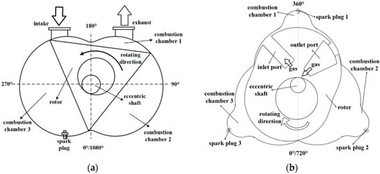 The comparison diagram of the WRE and XRE is shown in Figure 1. Their main difference is that the shape of the XRE rotor is similar to that of the WRE cylinder block, which is oval and the shape of the WRE rotor is similar to a triangle. At the same time, their combustion chamber volume change rules, intake and exhaust positions, and sealing methods are also very different.