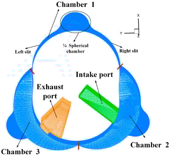 As shown in Figure 1b, the combustion chamber of the XRE in the combustion stage consists of two parts, a fixed 1/4 spherical area and a slit area that varies with the rotor rotation. The spark plug is located at the top of the combustion chamber. The engine is cycled at every 720 °CA. The volume of the chamber reaches a minimum at the top dead center of 360 °CA. The CFD model developed is based on the XMv3 engine and the specific geometric parameters are shown in Table 1.