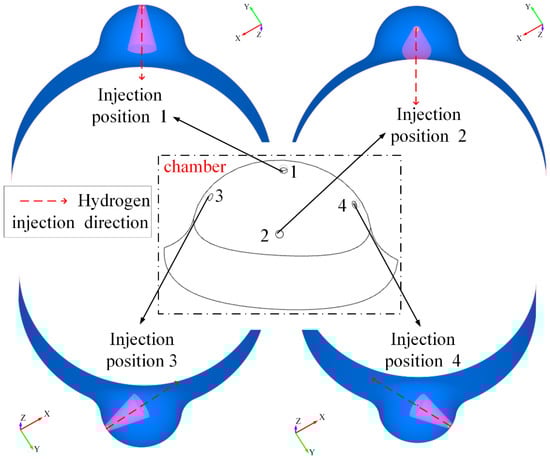 The hydrogen is injected into the combustion chamber using DI. Namely, the hydrogen nozzle is perforated at a specific location in the engine block and the hydrogen is injected directly into the combustion chamber through the nozzle. The injection pressure is set to 0.5 MPa, the injection timing is 70 °CA BTDC, the injection pulse width is 3.5 °CA, and the hydrogen energy fraction is controlled to 3%. The specific parameters are shown in Table 3. Moreover, three nozzles are installed in three combustion chambers, respectively, and the nozzle diameter is 1 mm. In order to investigate the effect of different injection positions on the engine’s combustion performance, four nozzle positions are set up for comparison. Figure 3 shows these four positions at the top, bottom, left, and right of the 1/4 spherical combustion chamber. The injection direction is as shown by the red arrow, which is sprayed to the central ignition position of the spherical combustion chamber.