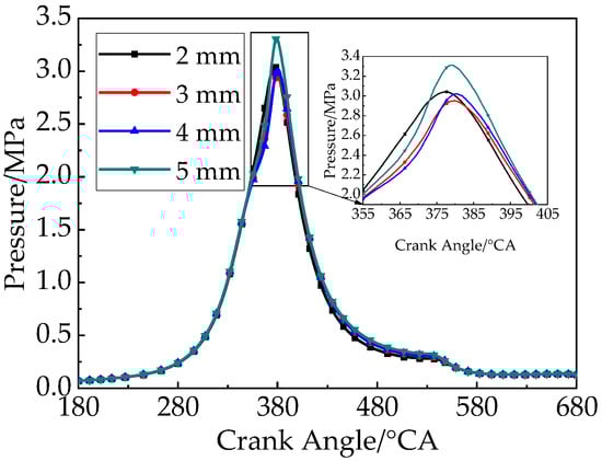 In order to ensure the accuracy of the calculation results and high computational efficiency, the model was verified for grid independence. Four basic combustion chamber grid sizes of 2, 3, 4, and 5 mm were set. The combustion simulation of pure gasoline was carried out with the parameters given in Table 2. Figure 4 shows the variation of the in-cylinder mean pressure versus crankshaft angle for different chamber grid sizes. As the grid accuracy increases, the difference between the calculated results for grids within 5 mm becomes smaller and smaller. This indicates that the grid independence is verified. To balance computational cost and high computational accuracy, a basic grid size of 3 mm with adaptive encryption is used for the numerical simulations in this paper.