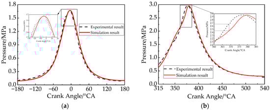 Pressure verification of experimental and simulation results: (a) pressure comparison between intake and compression processes at 10,000 RPM, (b) pressure comparison in combustion process at 9000 RPM.