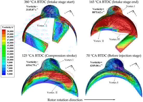The distribution of the hydrogen–gasoline mixture in the combustion chamber determines the engine’s combustion performance and the injection of hydrogen under different injection positions has significant differences in the formation of the mixture. It is important to study the in-cylinder flow field motion and the formation of the mixture for the subsequent combustion process. Since there is no significant difference in the flow field before hydrogen injection, it is divided into two parts for flow-field analysis before and after injection. Figure 6 shows the vorticity and flow distribution from the beginning of the intake stage to before the hydrogen injection at position 1.