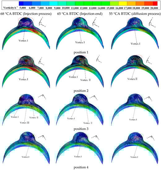 At position 2, the hydrogen is injected from the front to the rear of the combustion chamber, which causes the airflow to form vortex I near the nozzle first. The hydrogen injection makes the vorticity at the nozzle and the rear of the combustion chamber very high. Subsequently, vortex I diffuses into two vortexes. Furthermore, the main vortex I still diffuses in the direction of the nozzle and the split secondary vortex II converges at the right side of the top of the combustion chamber. At the moment of 55 °CA BTDC, vortex I has broken up and the radius and vorticity of vortex cluster II are significantly reduced.