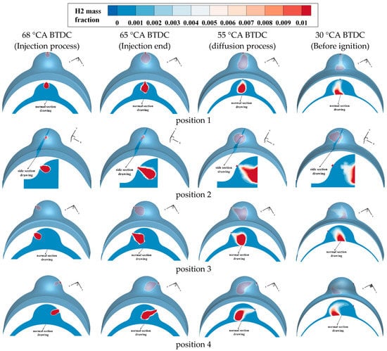 The flow of these mixtures and the change of vortexes will in turn affect the subsequent hydrogen flow, which causes the difference in in-cylinder hydrogen distribution before ignition. Figure 8 shows the hydrogen distribution in four stages of the hydrogen injection process (68 °CA BTDC), end of injection stage (65 °CA BTDC), hydrogen diffusion process (55 °CA BTDC), and ignition moment (30 °CA BTDC) for different injection positions, and also gives a section drawing of the combustion chamber interior.