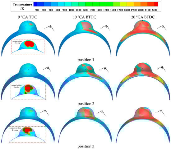 In order to compare the differences produced by the hydrogen injection under different positions in the combustion phase, Figure 9 presents the comparison of the in-cylinder temperature clouds at three moments of the combustion phase. According to the temperature field distribution, the larger temperature gradient can be regarded as the flame front surface. The in-cylinder combustion can be more clearly understood by observing the propagation process of the flame front surface.