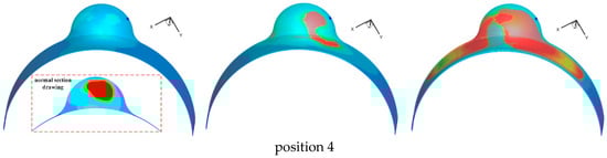 At 10 °CA ATDC, this is the middle moment of the obvious combustion period. The difference in the flame front surface under the four positions is large. At position 1, the flame front surface propagates to the right of the combustion chamber’s curved wall and the bottom of the combustion chamber. This indicates that the combustion is mainly in the lower and middle parts of the combustion chamber’s right. At position 2, the flame spreads widely. The flame front surface is distributed on the top and right, the bottom and rear of the combustion chamber. Meanwhile, a part of the flame has begun to spread to the right slit. Although the area shown by the flame front surface on the wall of the combustion chamber is not very large, it can be seen that the inside combustion is very intense. At position 3, the flame front surface has propagated to the curved wall, the bottom, and the rear of the combustion chamber. It shows that the flame area is more concentrated, mainly located in the middle of the combustion chamber and the combustion range is larger. At position 4, the combustion area is mainly concentrated in the lower of the combustion chamber. Furthermore, the flame front surface spread to the curved wall surface and the bottom of the combustion chamber. However, the distribution is less, indicating that the combustion at position 4 is relatively less intense. Therefore, the combustion areas at this moment are all located in the spherical combustion chamber and are the largest at position 2 and the smallest at position 4.
