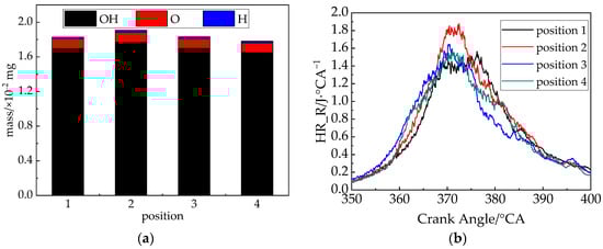 OH, H and O radicals are essential intermediates in the combustion process and play an important role and they can characterize the intensity of chemical reactions. In particular, the blending of hydrogen will improve the reaction rate of the OH + H2⇔H2O + H branched chain and accelerate the gasoline combustion [46]. The sum of the peak mass of OH, O and H radicals at different positions is shown in Figure 10a. The peak mass is the largest at 1.91 × 10−2 mg at position 2 and the smallest at 1.78 × 10−2 mg at position 4. It can be found that the different positions produce differences in the generation rate of OH radicals due to the distribution of hydrogen during the combustion process. In return, the change of radicals will directly affect the in-cylinder combustion rate. Figure 10b shows the variation curve of the in-cylinder HRR with the crank angle. It can be seen that the HRR shows a trend of increasing and then decreasing with the increase in crank angle. In the obvious combustion period of 5 °CA BTDC–20 °CA ATDC, the HRR reaches the highest value at different positions. The highest HRR of 1.88 J/°CA is found in position 2. At the same time, the time when the HRR maintains a high value is the longest at position 2, which indicates that the combustion duration is longer. In short, the variability of hydrogen injection leads to a difference in the reaction rate of the branched chains during the combustion process, which affects the HRR. Furthermore, the fastest chemical reaction and combustion rate are observed at position 2.