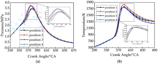Comparison of in-cylinder mean pressure and temperature at different positions: (a) pressure, (b) temperature.