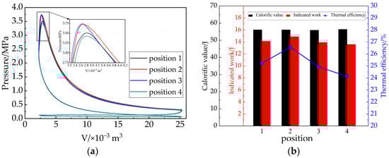 The main reason is as follows. The peak pressure and pressure rise rate are two important combustion characteristic parameters that affect the engine performance. According to Figure 11a, it can be found that the peak pressure and the pressure rise rate are very high in positions 2 and 3, so their thermal efficiency will be correspondingly high. However, due to the poor combustion effect and incomplete combustion in the post-combustion period, the pressure drops faster after reaching the peak at position 3, which will cause the area of the P-V diagram to be reduced. Furthermore, the indicated work is reduced, and the thermal efficiency decreases.