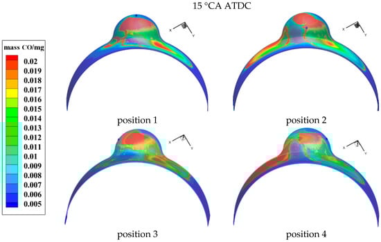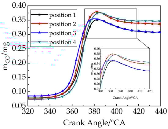 As an intermediate product of gasoline combustion, the distribution and content of in-cylinder CO can reflect the intensity and completeness of fuel combustion [48]. Figure 13 shows the distribution of in-cylinder CO at different positions, which is the most intense stage of in-cylinder combustion at 15 °CA ATDC. The rich distribution area of CO is not only the area where the flame front surface is located but also the place where the instantaneous oxygen amount is small and the combustion is most intense. It was found that the CO distribution in the right of the combustion chamber does not differ much at the four positions. However, the main difference is on the left of the slit. Furthermore, the CO distribution area on the left of the slit at positions 2 and 4 is larger than that at positions 1 and 3 and the CO distribution on the left is more at position 4. Figure 14 shows the curve of in-cylinder CO mass with the crank angle at different positions. The mass of CO emission shows a rapid increase and then a slow decrease with the increase in crank angle. The CO generation at positions 2 and 4 is faster than that at positions 1 and 3, which coincides with the distribution of CO as shown in Figure 13.