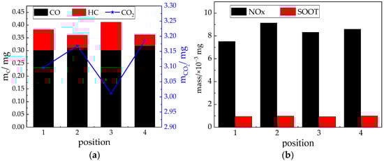 At position 4, the highest CO2 emission of 3.18 mg was found and the highest CO emission of 0.32 mg was also found, but the lowest unburned HC emission of 0.04 mg was found. After adding up the incompletely burned CO and HC, the highest unburned carbons of 0.42 mg were found at position 3 and the lowest unburned carbons of 0.36 mg were found at position 2. It was also found that most NOx is discharged at position 2, which is 9.15 μg. In addition, the carbon soot emission masses at different positions do not differ significantly and are all in the range of 0.9–1.0 μg.