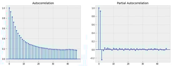 The null hypothesis corresponds to , which means that the lagged value is irrelevant for predicting the change of the target at time t. If the null hypothesis can be rejected, the process is stationary, has no unit root and exhibits reversion to the mean, which means that the lagged value is relevant for predicting the change of the output. After confirming that the time series are stationary, autocorrelation analysis is taken into consideration to measure a set of present values against past values to check if they correlate. Because wave heights are highly volatile, it is essential to determine the internal correlation using a plot of the autocorrelation of a time series of wave height by lag called the autocorrelation function (ACF). The autocorrelation and partial autocorrelation functions with lag k are defined in Equations (2) and (3):