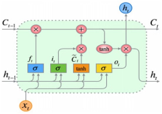 The widely used LSTM network architecture was proposed by Sepp Hochreiter and Jrgen Schmidhuber [] to address the gradient disappearance problem in practice. The hidden layer is the only separate component between standard LSTM and RNN, and they are referred to as LSTM cells in the LSTM architecture, as shown in Figure 8 []. For a given time , the LSTM cell has the layer input and output, and , respectively, which is kind of similar to RNNs. The LSTM, each computational unit is linked not only to a hidden state but also to a cell input state, , as well as a cell output state, , together with the previous cell output, in order to train and update the parameters. By adjusting constant gain transfer equal to 1, changed to to spread errors without any disappearing gradient phenomena in previous processes. Because of the gated layout, LSTM can manage long-term dependencies to allow relevant information to pass along the LSTM network. In an LSTM, there are three gates: an input gate, a forget gate and an output gate present. The forget gate allows LSTM to be an efficient and scalable model for many sequential data-related learning problems []. The cell’s status can be changed via a door that allows or prevents updating through an input gate. Likewise, at the output gate of the LSTM unit, a door regulates whether the state of the cell is transmitted. The most common version of LSTMs also utilises a forgotten gate to reset the cell status. At time the input gate, the forget gate, and the output gate are defined as , and , respectively. The input gate, the forget gate, the output gate, and the input cell state are represented by colourful boxes, while pink circles are arithmetic operators and the coloured rectangles are the gates in the LSTM cell in Figure 8.