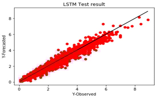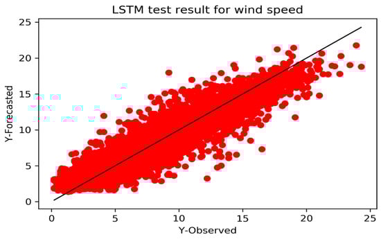 The above-outlined LSTM methodology is applied to the datasets and software design described in Section 2 to, respectively, train and test the proposed weather forecasting model using Python programming. In LSTM, each time step of the test dataset will be used one at a time. The results of the LSTM weather forecasting models are shown in Figure 9 and Figure 10 and found that LSTM-model-forecasted values are close to the tested values of the wave height and wind speed and follow the expected pattern, despite having slight differences noticed in the case of wind speed prediction which is due to the wind speed stochastic behaviour. This is further confirmed by error analysis of LSTM-based weather forecasting models as shown in Figure 11 and Figure 12.
