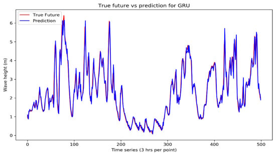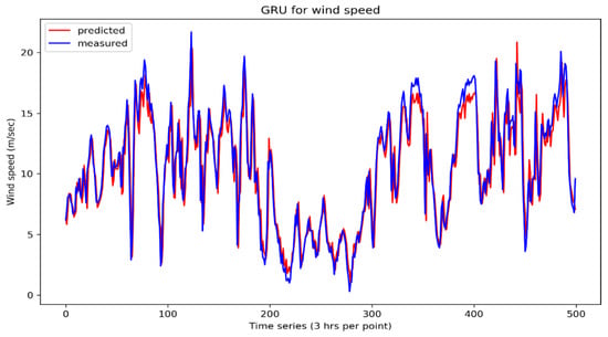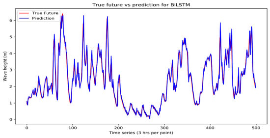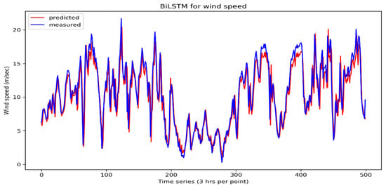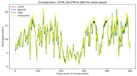 These proposed data-driven models for weather condition forecasting have been shown to be successful based on the analysis mentioned above. In this section, the performance comparison of these techniques is discussed. For the sake of simplicity and a better understanding of the comparative analysis of the proposed methods, the sample of 500 weather data points was used for comparing the performance of LSTM, BiLSTM and GRU models and the results are shown in Figure 23 and Figure 24, respectively. It has been suggested that all models show a similar kind of accuracy while forecasting wind speed and wave height; however, GRU is faster but less accurate compared to LSTM and BiLSTM as they use fewer training parameters and hence consume less memory. Therefore, for larger datasets, LSTM and BiLSTM were found to be suitable. This is further validated by the performance metrics as described below.