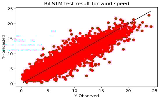 A recurrent neural network used primarily for natural language processing is called bidirectional LSTM (BiLSTM). Unlike standard LSTM, the input flows in both directions, and it is capable of using information coming from both sides. In conclusion, BiLSTM reverses the direction of information flow by adding one extra LSTM layer. It simply means that in the additional LSTM layer, the input sequence flows backwards. The outputs from the two LSTM layers are then combined in a variety of ways, including average, sum, multiplication, and concatenation as illustrated in Figure 13. A theoretical description of the BiLSTM technique can be found in []. Using pre-processing datasets, the BiLSTM model for weather forecasting was constructed and the results are shown in Figure 14 and Figure 15, respectively, and suggest that the forecast follows the measured values and error analysis; Figure 16 and Figure 17 further confirm these analyses. It is worth noting that despite combining LSTM layers from both directions (i.e., BiLSTM), the accuracy is close to LSTM results: the details will be discussed in the upcoming section.
