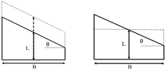 In exploring the effect of geometry on the heat transfer, simulations were performed for a range of aspect ratios (B/L = 1–8) and inclination angles of the cover relative to the horizontal (θ = 0°–60°), with each parameter varied independently, as shown in Figure 2. Although it may seem infeasible to consider single slope solar stills with low cover inclination angles such as 0° < θ < 10° (due to the possibility of condensed water droplets falling back into the brackish water basin) some studies have considered solar stills with external condensers and lower angles, down to an inclination angle of 0° [54], and so these conditions were included in this work too.