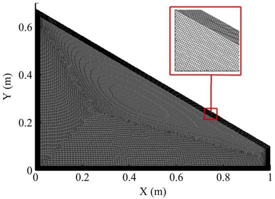 Given the spatial discretization used in CFD, it was crucial to perform a mesh sensitivity, and mesh independence, analysis to minimize the simulation time without decreasing the accuracy of the results. The grid used was structured with primarily quadrilateral elements and a smaller number of triangular elements (because of the angle in the enclosure) as shown in Figure 3.