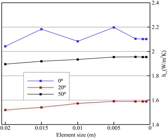 Additionally, the convective heat transfer coefficient at the hot surface was examined for a range of mesh sizes to determine when they became independent of the element size. Since the hot surface area was kept constant, the latter coefficient depends on the total heat flux of the hot surface, and the temperature difference between the hot and cold surface (Equation (1)). In Figure 4 it is apparent that there was no significant change to the heat transfer coefficient for elements smaller than 0.002 m, for all angles. Given this mesh independence, this configuration was used for the study.