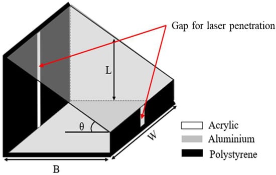 Despite this difference in transport media, the dimensions of the experiment and the silicone oil properties were matched such that the Rayleigh number (Equation (2)) in the experiments fell within the range of Rayleigh numbers likely to be encountered in normal single slope solar still operating conditions. To this end, an experimental single slope solar still-like geometry was fabricated with a 0.4 m × 0.4 m base (B × W), and back and front wall heights of 0.331 m and 0.1m respectively, giving a cover inclination of 30°, as shown in Figure 5.