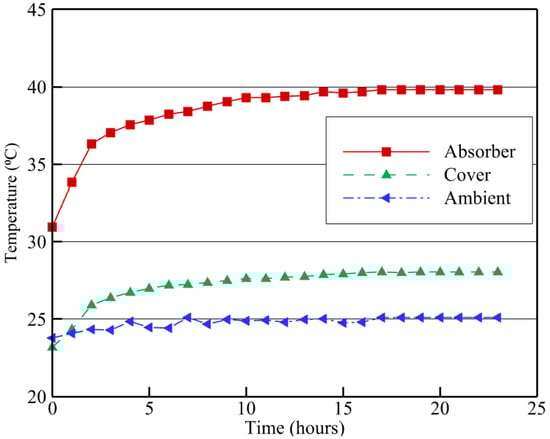 The fluid modelled in the simulation was assumed to be an incompressible ideal gas with the physical properties of humid air. It was assumed that the floor of the enclosure was heated with a constant temperature, while the inclined wall (the still cover) was cooled at a constant temperature as shown in Figure 1. Furthermore, under ideal conditions a solar still’s side walls are well insulated, hence the side walls in the simulation were assumed to be adiabatic [31,34,49,50].