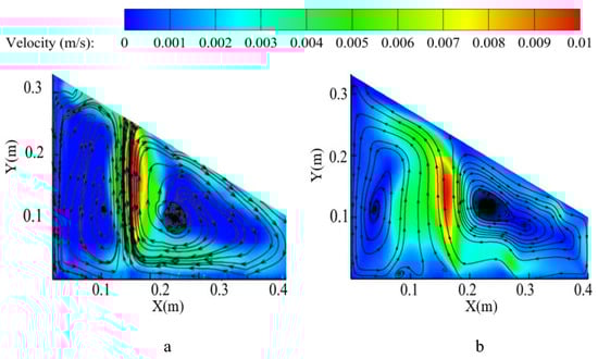 Cross-sectional velocity contour in the middle of the geometry (0.2 m, AR = 2.6, θ = 30°, Ras = 1.38 × 108), (a) experiment, (b) CFD simulation.