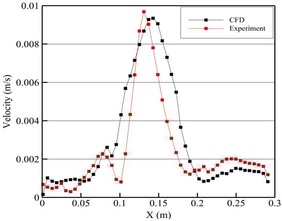 Examining this in more detail, a comparison of the velocity profiles across both the CFD simulation and the PIV experiment at the mid-height of the enclosure (Y = 0.16 m) was undertaken, as shown in Figure 9. Near the walls, both the simulation and measurements show that the velocity is very low compared to the velocity of the rising plume, and in general, the results from the simulations agree very well with the PIV measurements which gives confidence to the use of the CFD model. Although one may argue that the simulated plume is slightly wider than the experiment this can be attributed to the limited number of particles in the experimental study (particles at the density of the CFD mesh would impair optical access).