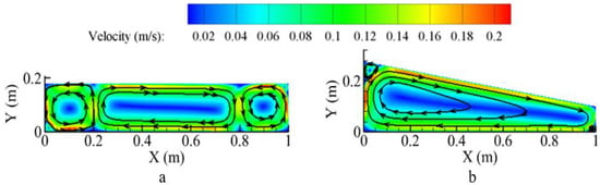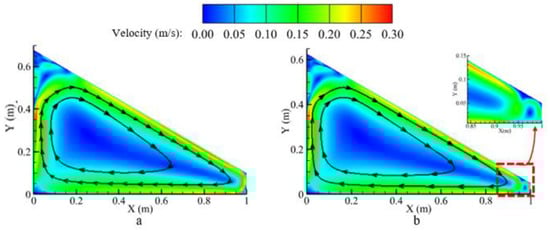 Velocity streamlines at AR = 5.52; (a) θ = 0°, (b) θ = 10°.