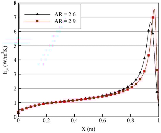 Convective heat transfer coefficient at θ = 30°, AR = 2.6, AR = 2.9.