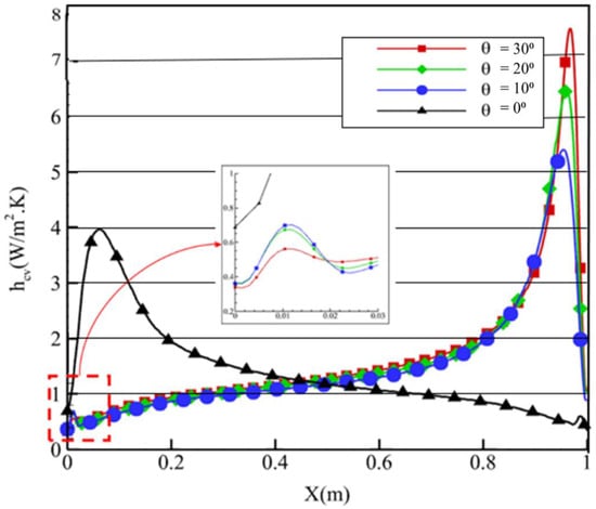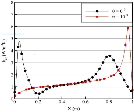 Convective heat transfer coefficient at AR = 5.52; θ = 0°and θ = 10°.