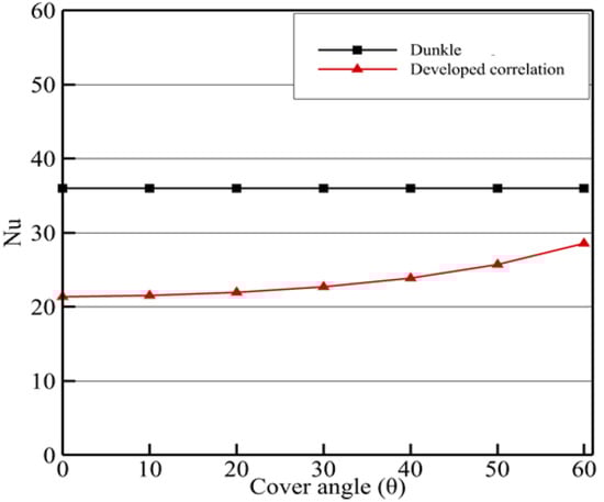 Furthermore, it is apparent that Dunkle’s relationship, despite widespread use in its original or modified form, is entirely independent of cover angle. As the angle increases, there is no change in the Nusselt number (at a constant aspect ratio). This also helps clarify the reasons for the contradictory observations reported in the literature relating to the optimum cover angle.