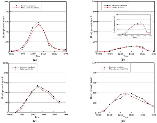 Predicted hourly yield against measured data, (a) Manoj Kumar et al. [59], (b) Attia et al. [60], (c) Rabhi et al. [58], (d) Shawaqfeh and Farid [28].