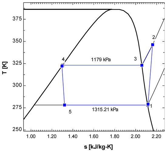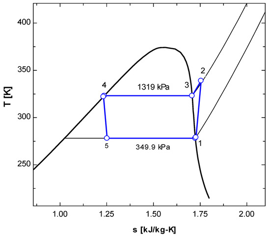 In the T-s diagram of R134a (Figure 2), the pressure at the condenser temperature was 1319 kPa, while the pressure was 349.9 kPa at the evaporator temperature. In the T-s diagram of R152a (Figure 4), the pressure at the condenser temperature was 1179 kPa, while at the evaporator temperature, the pressure was 1315.21 kPa. In both Figure 2 and Figure 4, it may be observed that the compression (1-2) is not isentropic as the line is not vertically straight but inclined to right indicating increase in entropy. When the superheated vapour comes out of the compressor at state 2, its temperature is higher than condensation temperature (temperature at state 3). In the condenser, initially temperature drops but once the phase change (condensation) starts, the temperature remains constant (process 3-4).