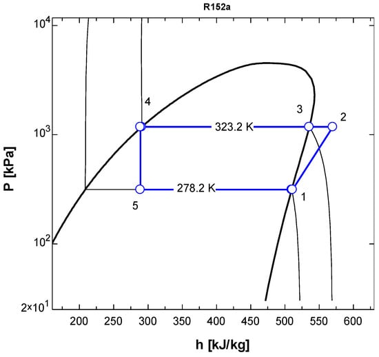 P-h diagram of vapor compression refrigeration cycle running with R152a.