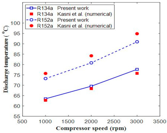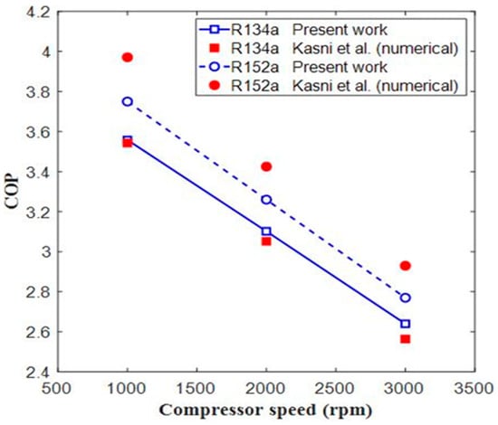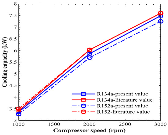 Figure 7 shows the comparison of discharge temperature vs. compressor speed. In Figure 7, the discharge temperature for refrigerant R134 showed a maximum error of 2.57%, which took place at 3000 rpm, while the maximum error for R152a was 4.10% at 3000 rpm. In Figure 8, the cooling capacity showed a maximum error for refrigerant R134a at 2.73% that took place at 2000 rpm, while for refrigerant R152a, the maximum error was 6.4%, which took place at 1000 rpm. The error may be due to the thermo-physical properties of CoolPack and EES software or due to the computational accuracy of these two software programs. It was estimated that there is close agreement between the present and already-published results. Hence, the current EES model was validated, and we could use it for further analysis of different refrigerants.