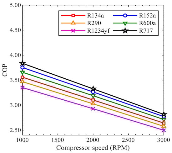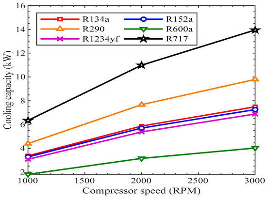 The amount of cooling generated in the evaporator is called the cooling capacity. In Figure 11, the variation of cooling capacity with the compressor speed is shown. The cooling capacity of each refrigerant is represented by lines of different colors. In all of the trend lines, the refrigerants’ cooling capacities increased with the rise in the speed of the compressor from 1000 to 3000 RPM. The mass flow rate of the refrigerants increased with the increase in compressor speed, which presents the reason for an increase in the cooling effect in the evaporator. This is why the cooling capacity of the evaporator rose with the rise in compressor speed for all the refrigerants. All the refrigerants showed a similar increasing trend with the rise in compressor speed. The refrigeration effects of R134, R152a, and R1234yf were closely related to each other at different speeds of the compressor. The cooling capacity of R600a was the smallest, while R717 was the highest among all the refrigerants.