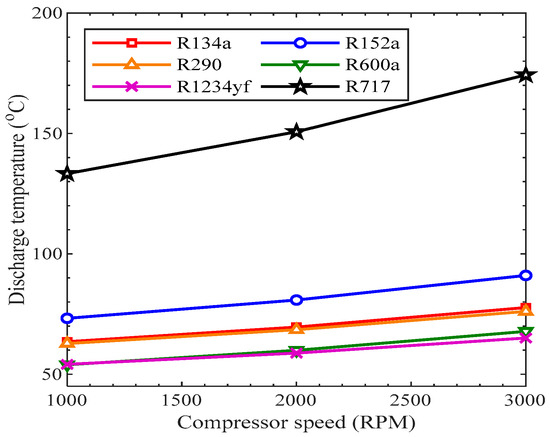 The temperature of the refrigerant at the outlet of the compressor is known as the discharge temperature. The performance of a working refrigerant may be predicted by this parameter, but the performance of an AACS is not directly relevant to this parameter. Figure 10 shows the variation of discharge temperature with the compressor speed for various working fluids. As shown, for all the considered refrigerants, the rise in compressor speed led to an increase in discharge temperature.