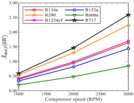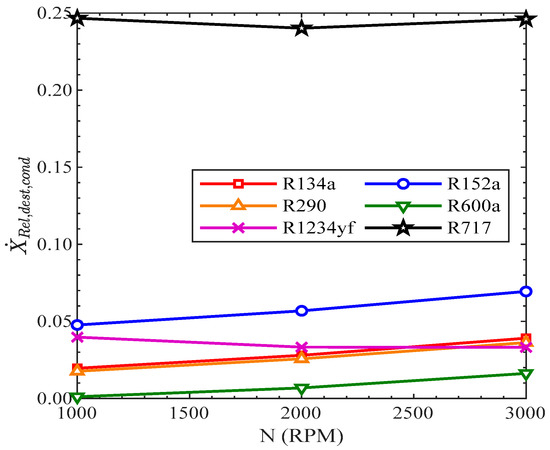 The relative exergy destruction in the condenser was highest in R717 and lowest in R600a at all speeds of the compressor.