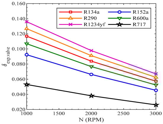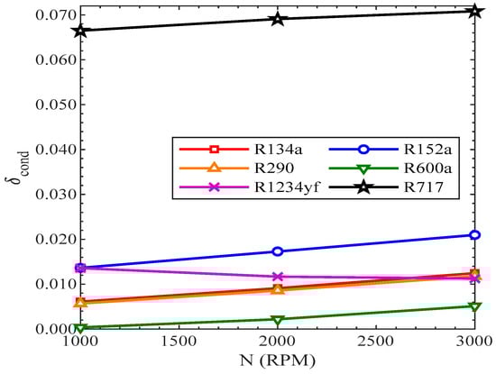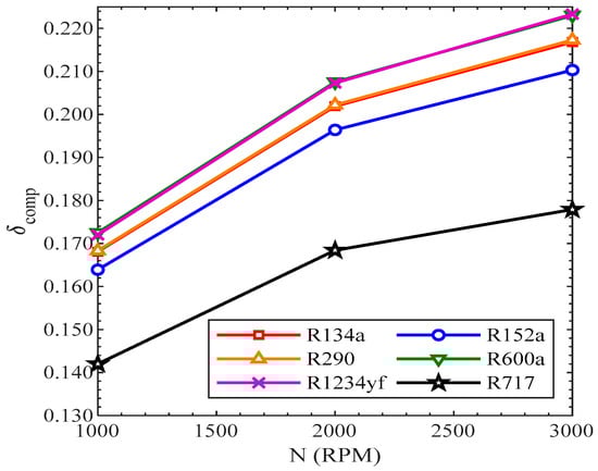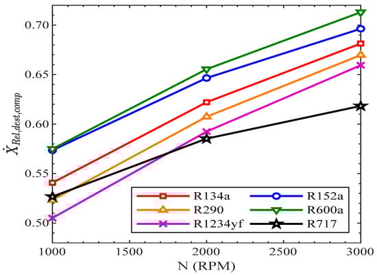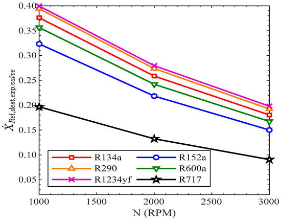 In Figure 13, the relative exergy destruction of the compressor rose with compressor speed in all the refrigerants. In R134a, the exergy destruction of the compressor was 54%, 62%, and 68% at the compressor speeds of 1000 RPM, 2000 RPM, and 3000 RPM, respectively. The relative exergy destruction of the compressor was highest in R600a from 1000 RPM to 3000 RPM. At 1000 RPM, the relative exergy destruction of the compressor was lowest in R1234yf, while at 3000 RPM, the exergy destruction of the compressor in R717 was lowest.