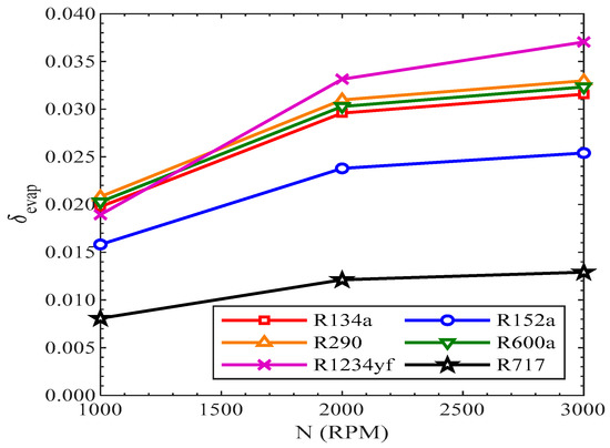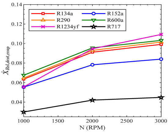 In Figure 16, the variation in the relative exergy destruction in the evaporator with the speed of the compressor is presented. All the refrigerants showed the same increasing trend with the increase in speed of the compressor. The relative exergy destruction in the evaporator was lowest for R717. The relative exergy destruction in the evaporator at 1000 RPM was highest for R600a and at 3000 RPM for R1234yf. For R134a, the values of relative exergy destruction in the evaporator were 6.36%, 9.1%, and 9.9% at 1000 RPM, 2000 RPM, and 3000 RPM, respectively.
