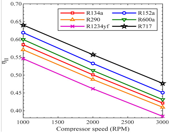 The main aspect of our study is to examine the exergy and first-law parameters on the basis of compressor speed. This paper analyzes six different refrigerants, where the condenser and evaporator temperatures remain constant, as mentioned in Table 1. Each refrigerant is environmentally friendly, having low GWP and ODP values. The refrigerants are studied on the basis of suitable thermodynamic properties. In addition, the refrigerants should have less exergy destruction and irreversibilities, as well as more second-law efficiency and COP.