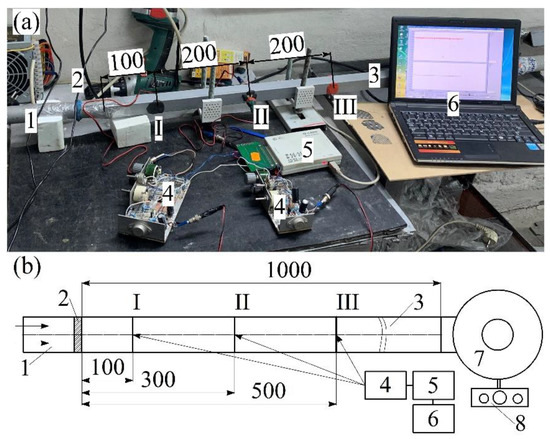 Photo (a) and scheme (b) of the test stand: 1—entrance section; 2—place of installation of the turbulator; 3—investigated pipeline with different cross-sections; 4—hot-wire anemometer of constant temperature; 5—analogue-to-digital converter; 6—laptop with software; 7—pump; 8—air flow control system; I, II, III—control section number.