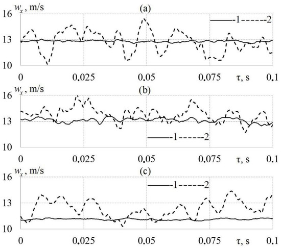 Dependences of the instantaneous values of the local (lx = 100 mm) velocity wx in time at the intensity of the flow turbulence TI = 0.02 (1) and TI = 0.12 (2) in pipes with different cross-sections: (a) round (average velocity w ≈ 13 m/s); (b) square (w ≈ 13 m/s); (c) triangle (w ≈ 12 m/s).